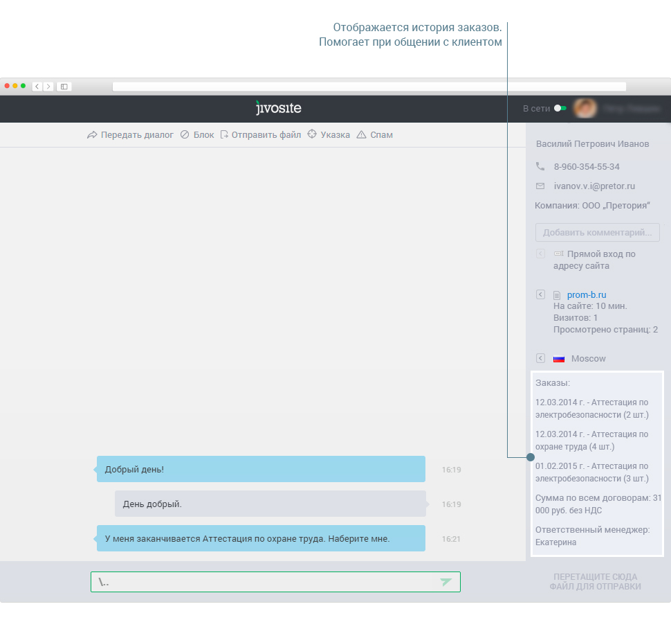 Если клиент обращается в компанию не в первый раз, то для оператора выносим подсказку с историей заказов и сведениях о первом обращении.