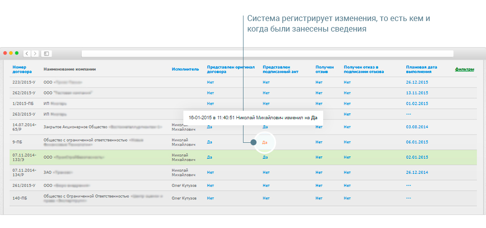 Для быстрого определения того, какие договоры или первичные документы не были представлены клиентом, мы разработали интерфейс, который отображает, когда и кем какой документ был принят в организацию.