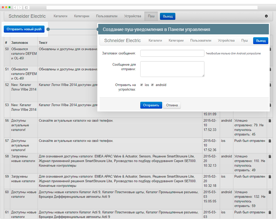 Мы также настроили автоматические уведомления при обновлении каталогов. Пользователей завалило сообщениями. Отказываемся от автоматических уведомлений. Делаем отдельный интерфейс, где push-уведомления создаются вручную.